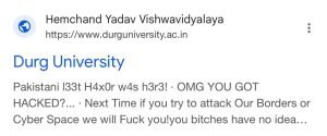 दुर्ग, छत्तीसगढ़। छत्तीसगढ़ के प्रतिष्ठित शैक्षणिक संस्थान हेमचंद यादव विश्वविद्यालय, दुर्ग (Durg University) की वेबसाइट हाल ही में साइबर हमले का शिकार हो गई है। छात्रों और आम नागरिकों को चौंकाने वाली यह घटना तब सामने आई जब किसी ने Google पर “Durg University” सर्च किया, तो विश्वविद्यालय की वेबसाइट का लिंक एक बेहद अभद्र, अशोभनीय और आक्रामक भाषा में लिखा हुआ संदेश दिखा रहा था।