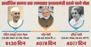 इंदिरा गांधी का लगातार कार्यकाल जनवरी 1966 से मार्च 1977 तक रहा, जो 4,077 दिनों तक चला। इसके बाद उनका दूसरा कार्यकाल 1980 से 1984 में उनकी हत्या तक रहा। लेकिन पहला लगातार कार्यकाल ही रिकॉर्ड के रूप में दर्ज रहा। वहीं मोदी ने भी इसी आकांक्षा को पार कर दिया है। उनकी यह उपलब्धि विशेष इसलिए भी है क्योंकि यह लगभग 48 साल पुराने रिकॉर्ड को तोड़ना है ।